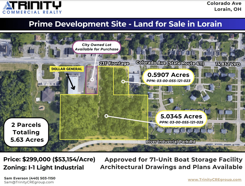 For Sale: 2 parcels of land in Lorain on Colorado Ave available for sale for $299,000. Parcels combine to 5.63 acres of industrial zoned land. The site is already approved for a 71-unit boat storage facility. Architectural drawings, floorplans, survey and geotechnical engineering report are already complete. There is 231′ of direct frontage on Colorado Ave, with additional frontage/acreage available to purchase with an adjoining city owned lot. Lorain is a popular boating destination with several large marinas and public boat launches nearby the site. Ohio Motorsports Park recently broke ground on the Lorain KartPlex development less than a mile away from this site, which will be completed in 2025 and will include indoor and outdoor racing tracks, retail stores, a corporate training and event center, eSports Arena, and a restaurant/brewery, among other things.