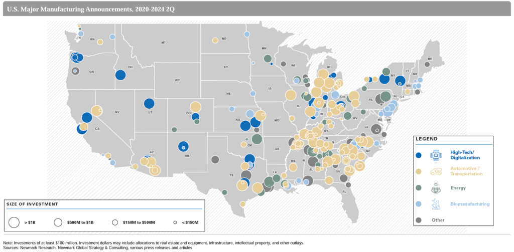 The above chart shows existing industrial real estate investments greater than $100M taking place across the US since 2020. Since 2020, over $530B of capital has been pledged across these projects. Between now and 2030, it is estimated that 270,000+ jobs will be created from these projects, with more than 270M square feet of industrial real estate built.