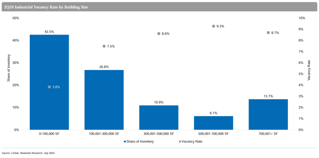 Industrial properties under 100,000 SF continue to lease strongly, with a vacancy rate of only 3.8% nationwide. The 4th tranche of properties (500,001-700,000 SF) has the highest vacancy rate, which currently sits at 9.3%.