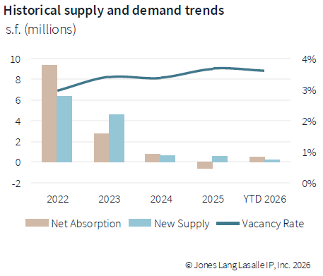 Across the board, brokerage reports painted a consistent picture of a market regaining its stride. According to JLL, the market posted a strong 502,118 square feet of positive net absorption, a significant turnaround from the negative figures recorded at year-end 2025. This activity was almost entirely driven by modern warehouse and distribution facilities, underscoring the market’s flight to quality.